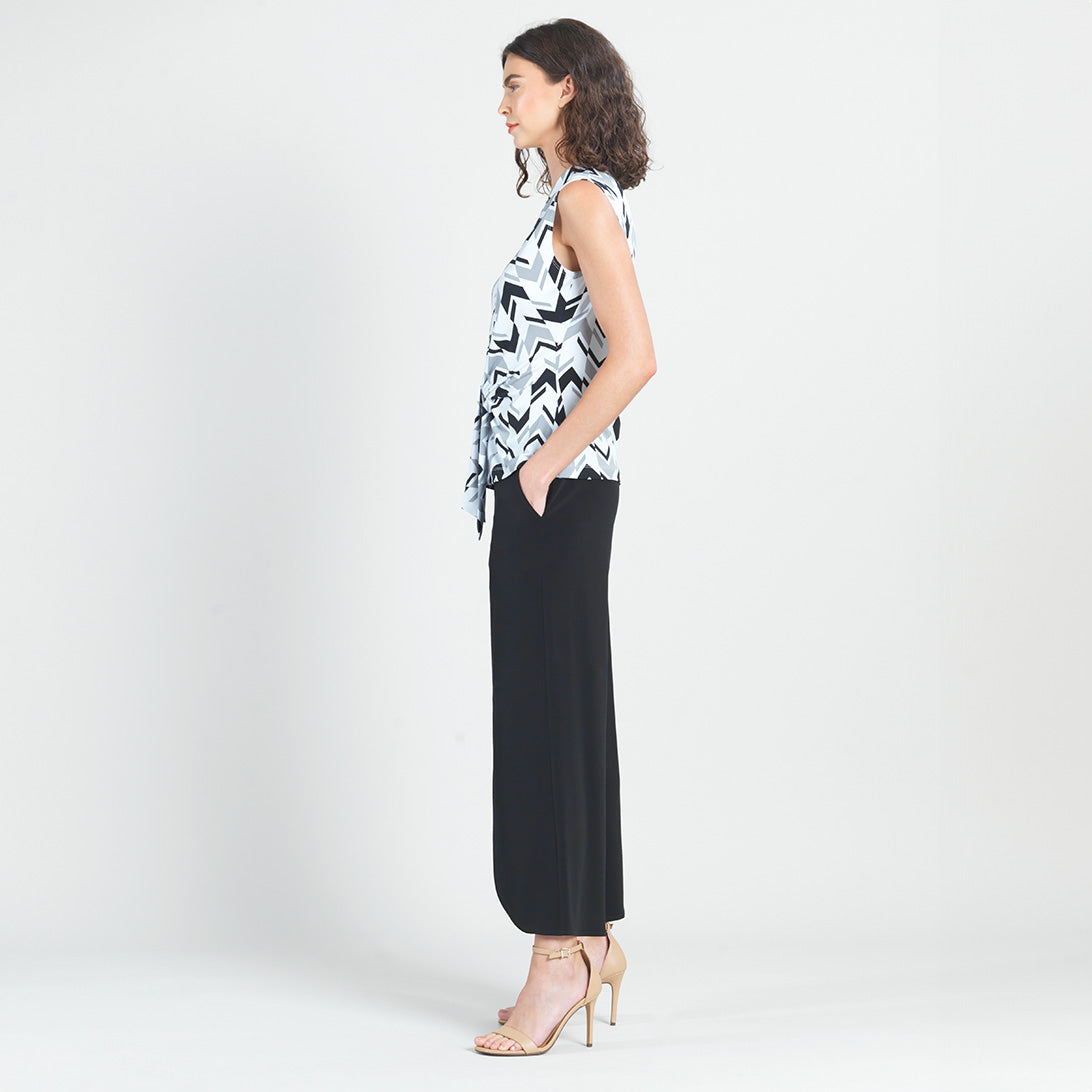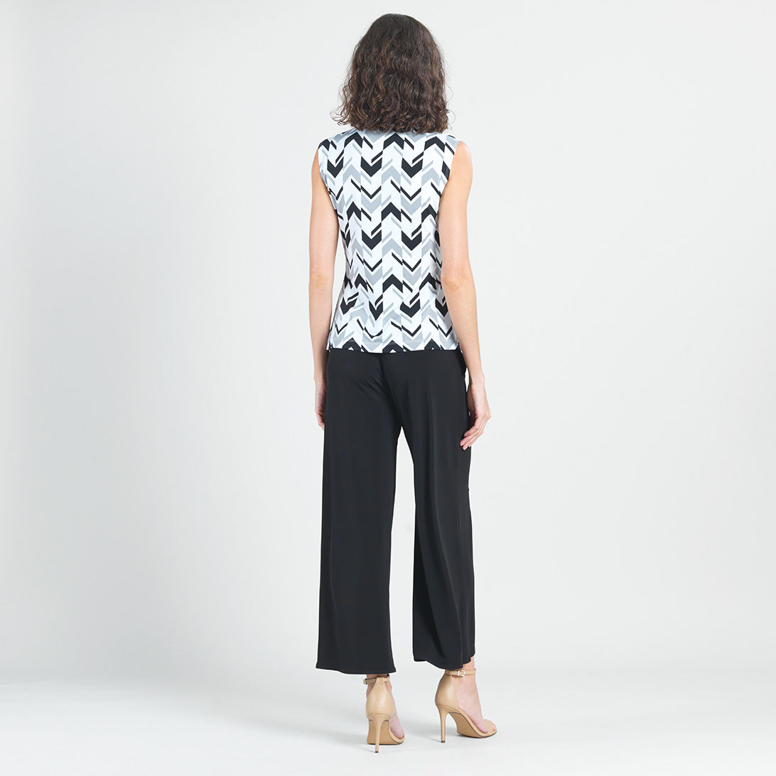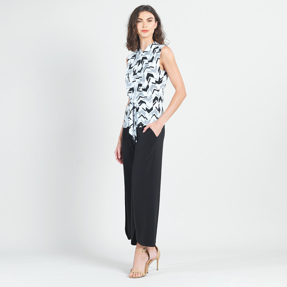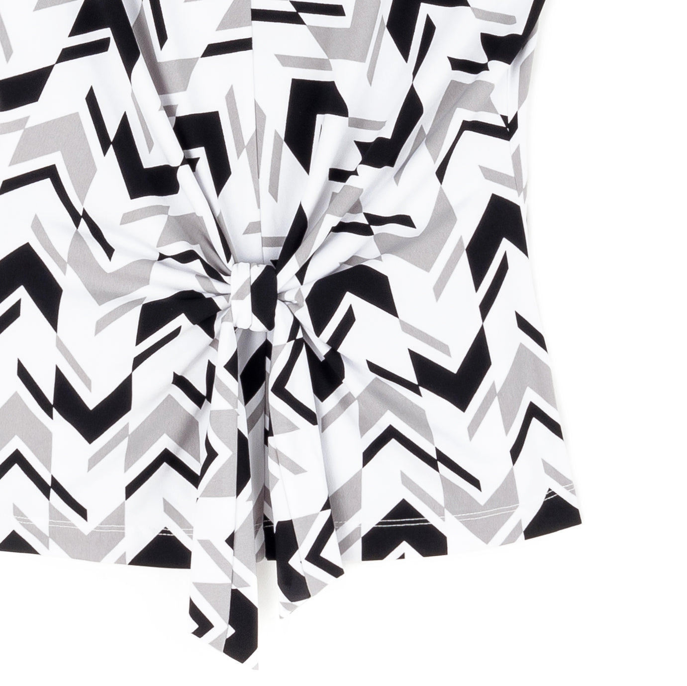 Don’t pass up our Chevron Stripe Sleeveless Center Front Tie Top… you’ve earned it! This flattering sleeveless top features a v-bottle neckline, a vertical neck-to-hem center seam, and a front-center waist tie that creates a beautiful draped effect that accentuates your natural figure. A graphic print, comprised of scattered chevron shapes in a stripe-like formation, in shades of black and cool-toned grey, against a white background. ♥ Each piece is a unique, one-of-a-kind print and print placement will vary. Carefree Travel Fabric – Soft Silky Knit Our signature poly blend fibers offer luxurious softness with lightweight, wrinkle-free comfort. This easy-care fabric is quick drying and cooler than linen or cotton, making it perfect for on-the-go wear.Wrinkle Free Travel Friendly Ultra Lightweight Soft Knit Fabric Breathable Jersey-Like Feel