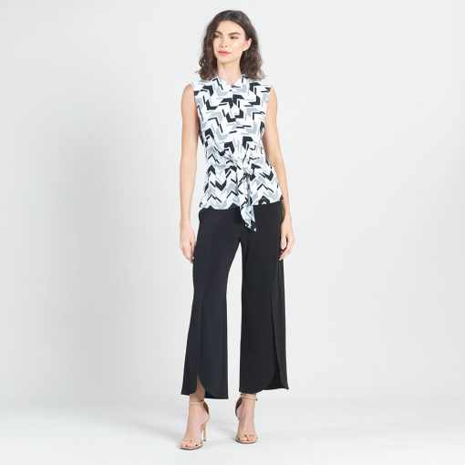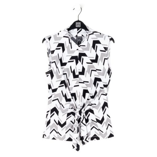Don’t pass up our Chevron Stripe Sleeveless Center Front Tie Top… you’ve earned it! This flattering sleeveless top features a v-bottle neckline, a vertical neck-to-hem center seam, and a front-center waist tie that creates a beautiful draped effect that accentuates your natural figure. A graphic print, comprised of scattered chevron shapes in a stripe-like formation, in shades of black and cool-toned grey, against a white background. ♥ Each piece is a unique, one-of-a-kind print and print placement will vary. Carefree Travel Fabric – Soft Silky Knit Our signature poly blend fibers offer luxurious softness with lightweight, wrinkle-free comfort. This easy-care fabric is quick drying and cooler than linen or cotton, making it perfect for on-the-go wear.Wrinkle Free Travel Friendly Ultra Lightweight Soft Knit Fabric Breathable Jersey-Like Feel