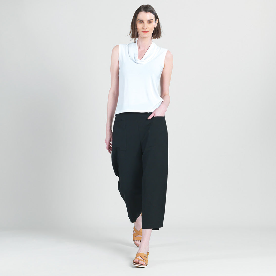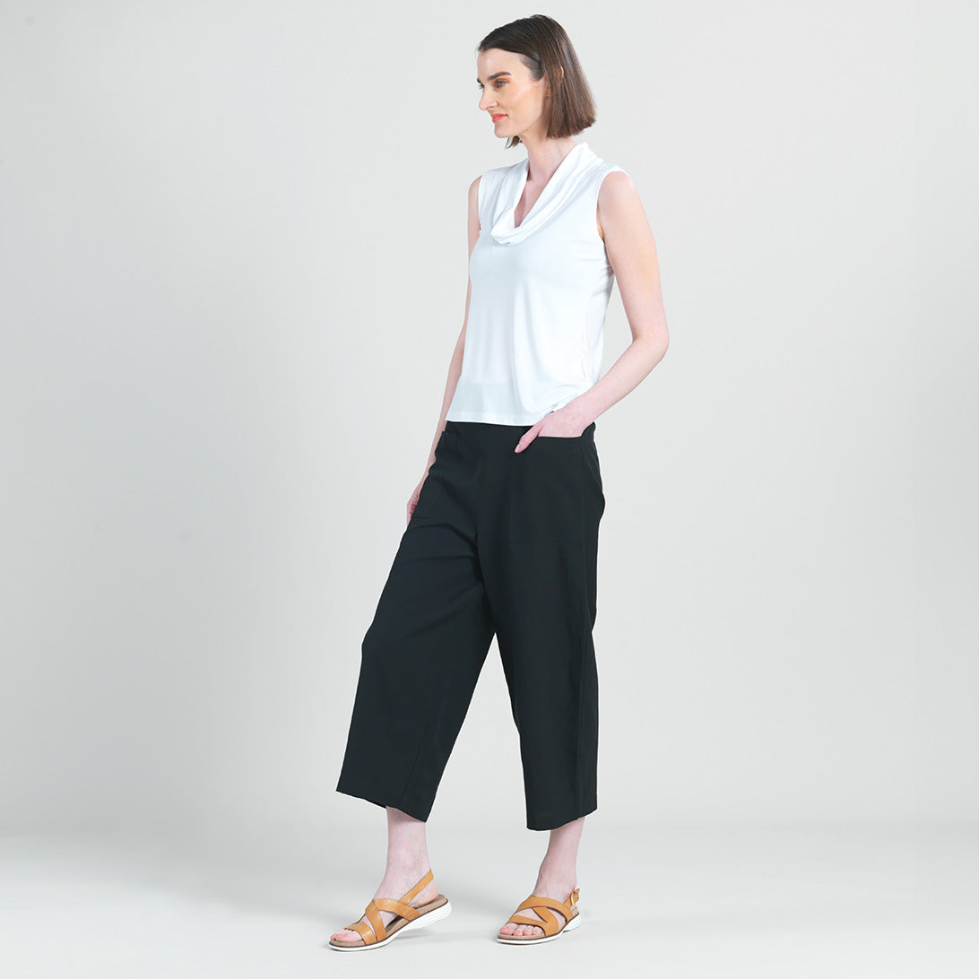 Our Sleeveless Draped Cowl Neck Top combines minimalist fashion with a modern twist! This sleeveless, bra-friendly top features a draped cowl neckline, bust dart details, and a straight hemline with 3″ side vents.Carefree Travel Fabric – Soft Silky Knit Our signature poly blend fibers offer luxurious softness with lightweight, wrinkle-free comfort. This easy-care fabric is quick drying and cooler than linen or cotton, making it perfect for on-the-go wear.Wrinkle Free Travel Friendly Ultra Lightweight Soft Knit Fabric Breathable Jersey-Like Feel