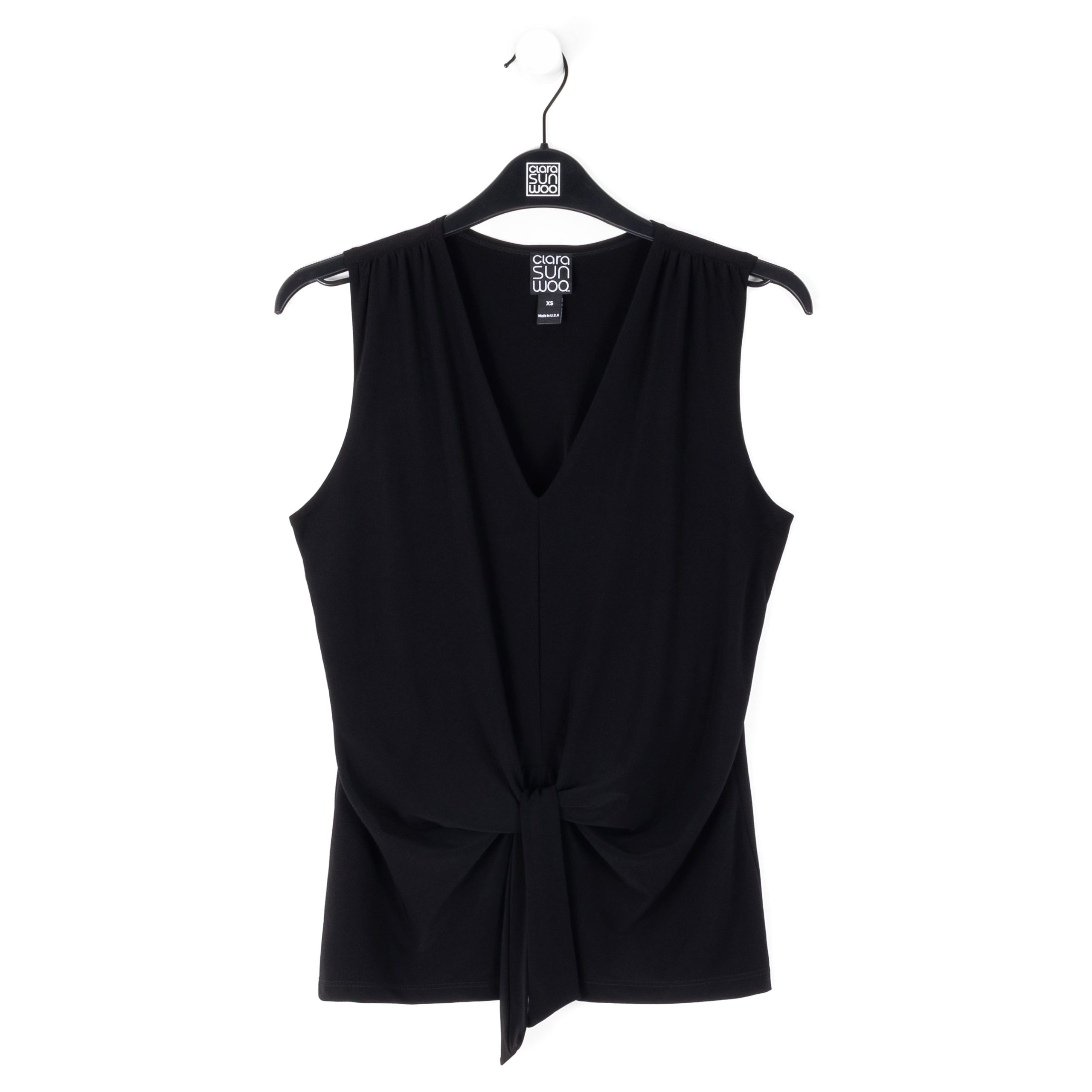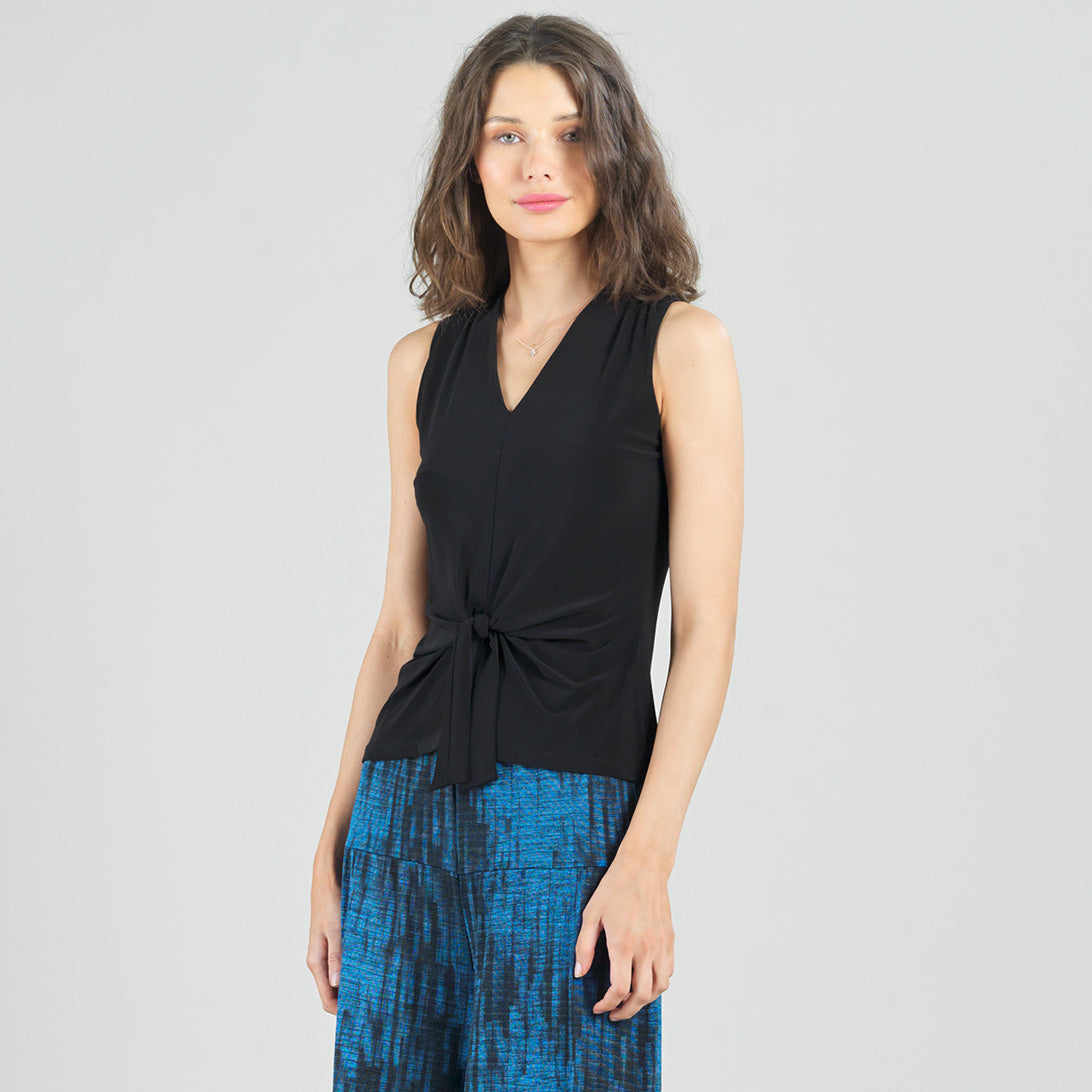 Our Sleeveless V-Neck Center Front Tie Top combines minimalist fashion with a modern twist! This flattering sleeveless top features a classic v-neckline, pleated shoulder seam, a vertical neck-to-hem center seam, and a front-center waist tie that creates a beautiful draped effect that accentuates your natural figure. Carefree Travel Fabric – Soft Silky Knit Our signature poly blend fibers offer luxurious softness with lightweight, wrinkle-free comfort. This easy-care fabric is quick drying and cooler than linen or cotton, making it perfect for on-the-go wear.Wrinkle Free Travel Friendly Ultra Lightweight Soft Knit Fabric Breathable Jersey-Like Feel