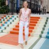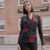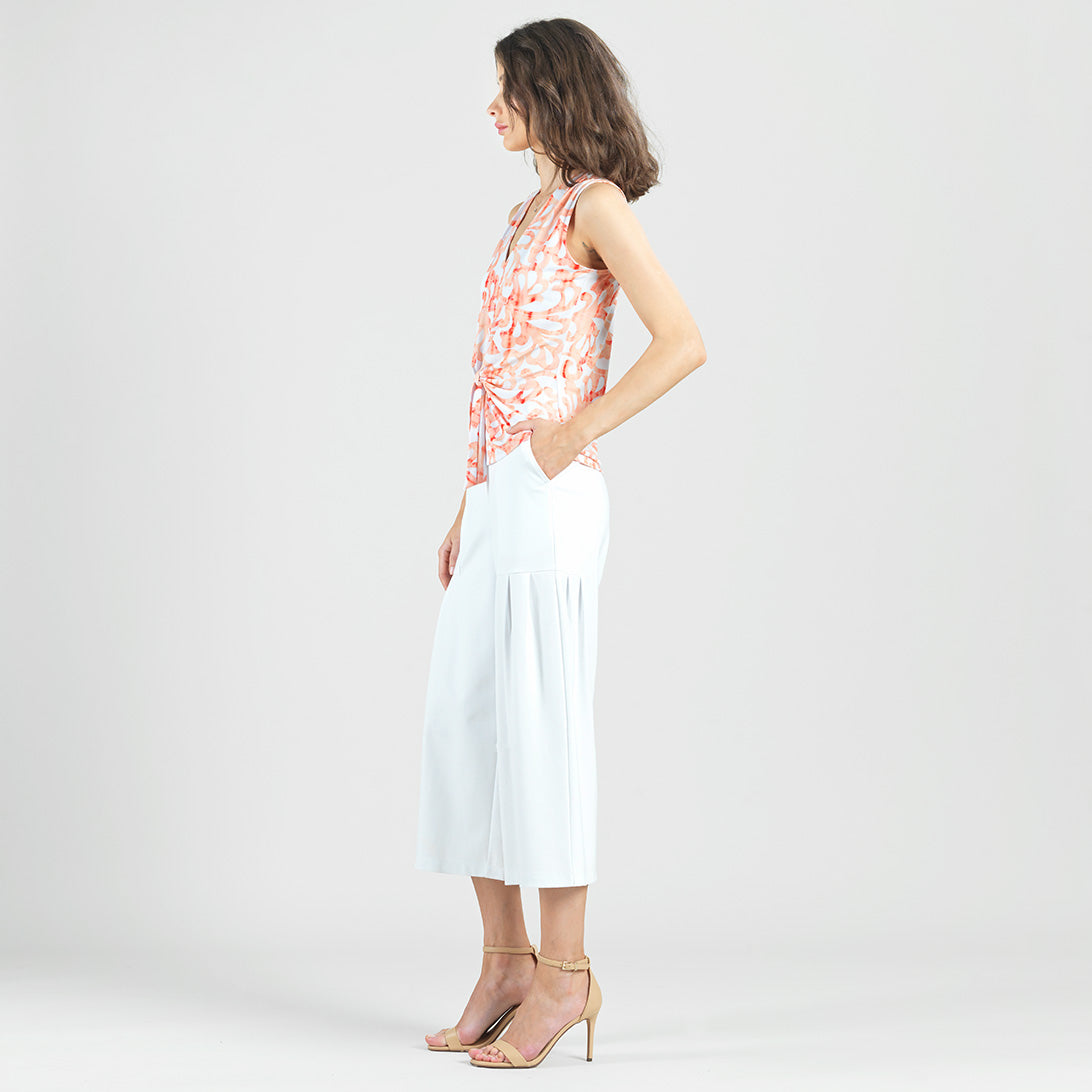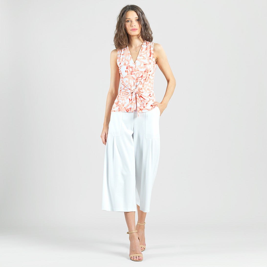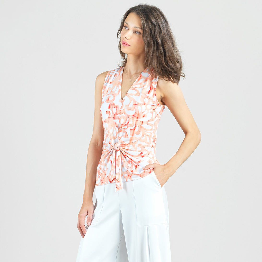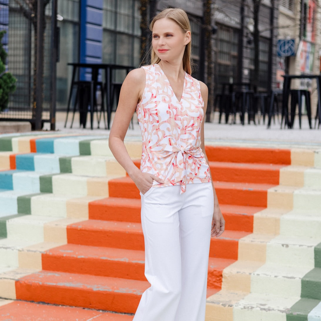 Damask and you shall receive… compliments by wearing our Damask Motif V-Neck Sleeveless Center Front Tie Top! This flattering sleeveless top features a classic v-neckline, pleated shoulder seam, a vertical neck-to-hem center seam, and a front-center waist tie that creates a beautiful draped effect that accentuates your natural figure. A timeless print displaying a traditional damask pattern of symmetric medallions re-imagined in soft watercolor shades of pale coral-orange, tomato red, and white that blend to create an artistic gradient. ♥ Each piece is a unique, one-of-a-kind print and print placement will vary. Carefree Travel Fabric – Soft Silky Knit Our signature poly blend fibers offer luxurious softness with lightweight, wrinkle-free comfort. This easy-care fabric is quick drying and cooler than linen or cotton, making it perfect for on-the-go wear.Wrinkle Free Travel Friendly Ultra Lightweight Soft Knit Fabric Breathable Jersey-Like Feel