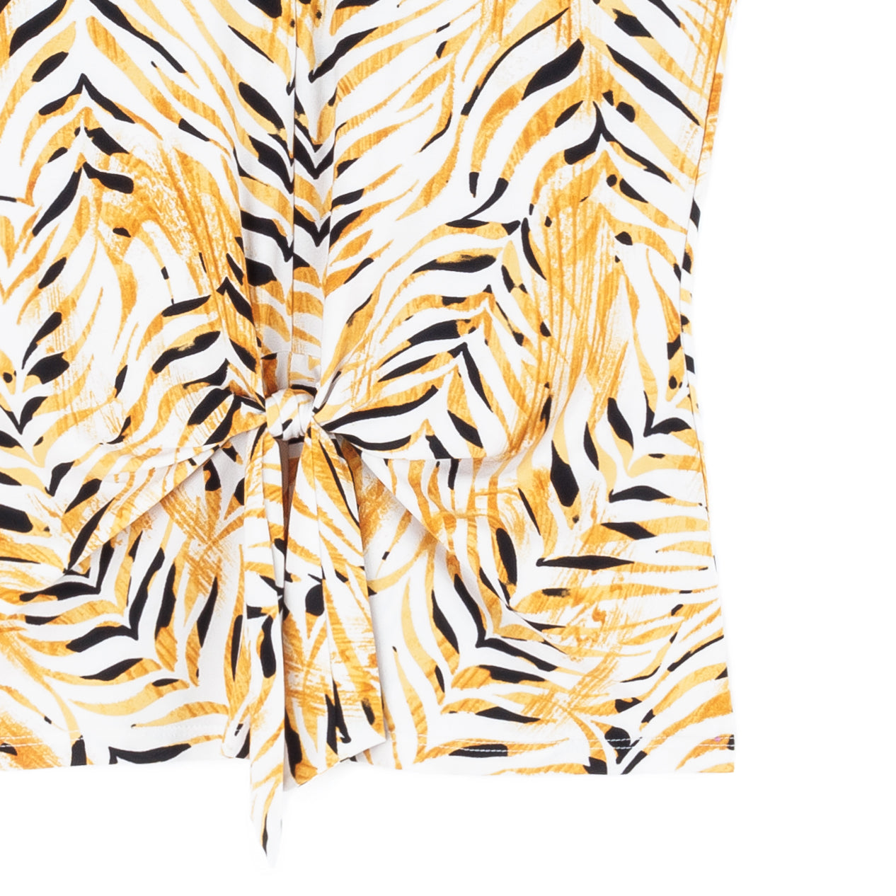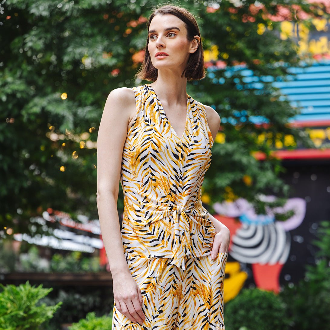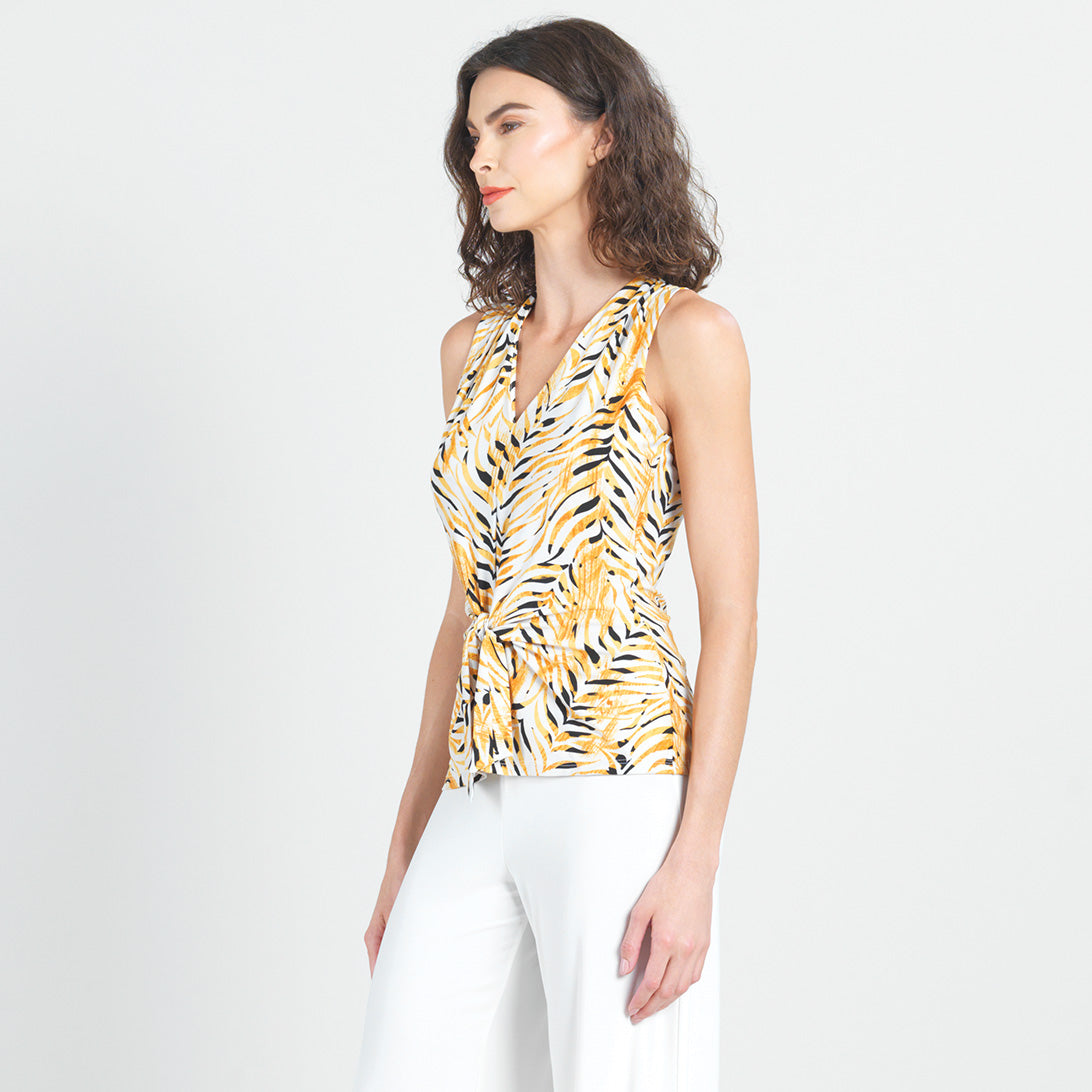 Wander aimlessly because you were born to be seen in our Wild Leaves Sleeveless V-Neck Center Front Tie Top! This flattering sleeveless top features a classic v-neckline, pleated shoulder seam, a vertical neck-to-hem center seam, and a front-center waist tie that creates a beautiful draped effect that accentuates your natural figure. A lively print, displaying a formation of wild leaves in shades of amber, black, and ivory that create striking tiger-like stripes. ♥ Each piece is a unique, one-of-a-kind print and print placement will vary. Carefree Travel Fabric – Soft Silky Knit Our signature poly blend fibers offer luxurious softness with lightweight, wrinkle-free comfort. This easy-care fabric is quick drying and cooler than linen or cotton, making it perfect for on-the-go wear.Wrinkle Free Travel Friendly Ultra Lightweight Soft Knit Fabric Breathable Jersey-Like Feel