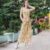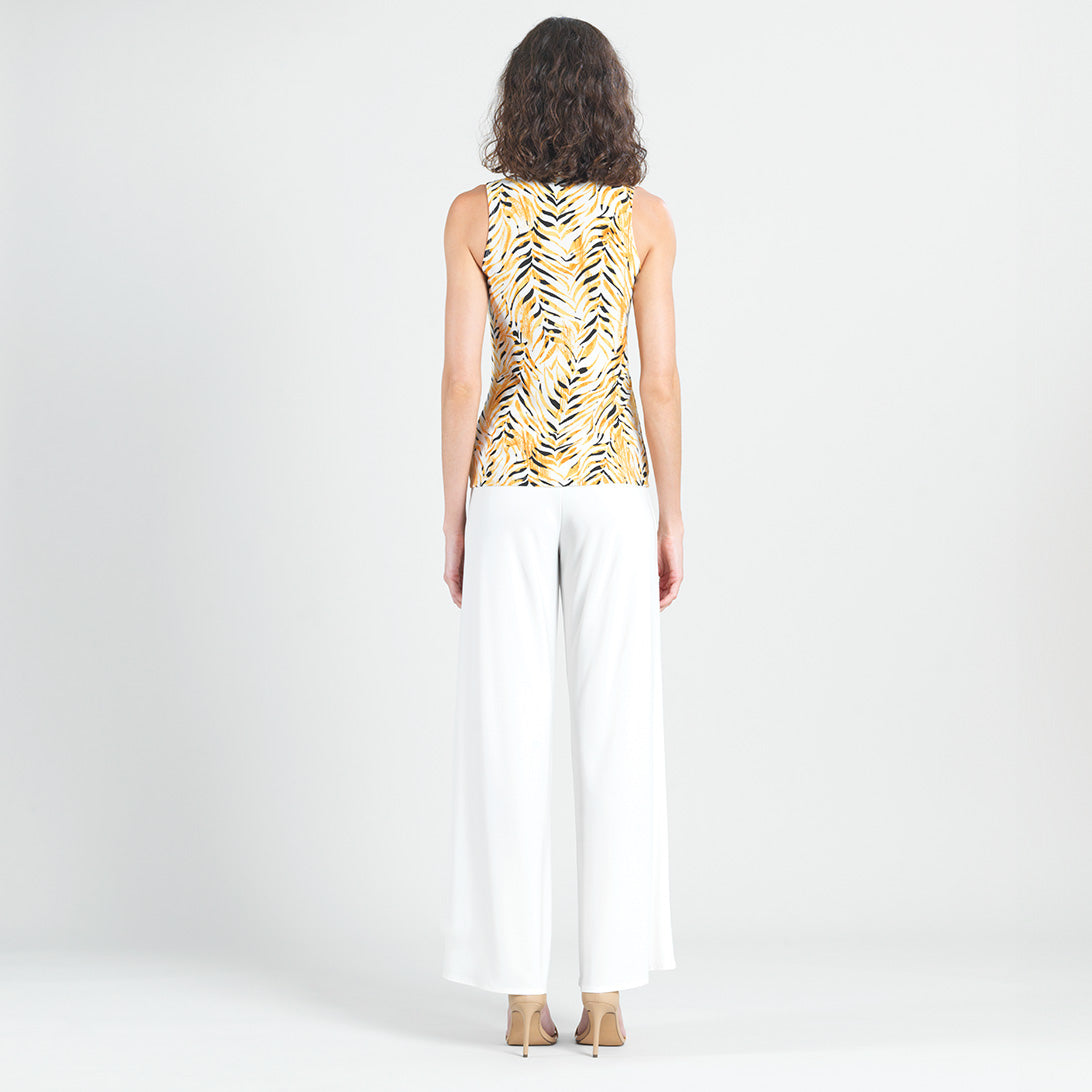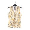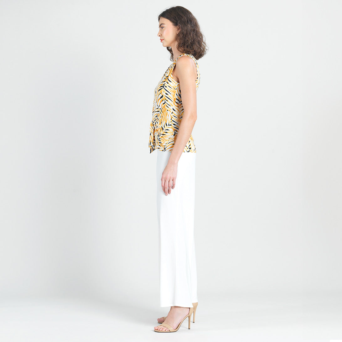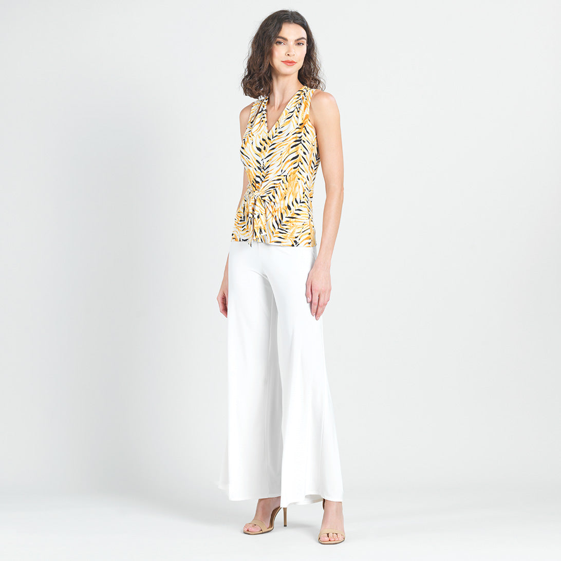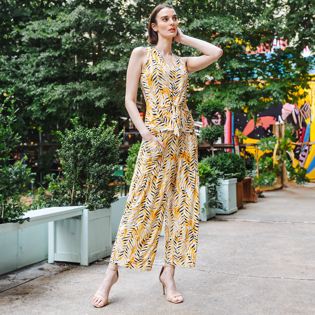 Wander aimlessly because you were born to be seen in our Wild Leaves Sleeveless V-Neck Center Front Tie Top! This flattering sleeveless top features a classic v-neckline, pleated shoulder seam, a vertical neck-to-hem center seam, and a front-center waist tie that creates a beautiful draped effect that accentuates your natural figure. A lively print, displaying a formation of wild leaves in shades of amber, black, and ivory that create striking tiger-like stripes. ♥ Each piece is a unique, one-of-a-kind print and print placement will vary. Carefree Travel Fabric – Soft Silky Knit Our signature poly blend fibers offer luxurious softness with lightweight, wrinkle-free comfort. This easy-care fabric is quick drying and cooler than linen or cotton, making it perfect for on-the-go wear.Wrinkle Free Travel Friendly Ultra Lightweight Soft Knit Fabric Breathable Jersey-Like Feel