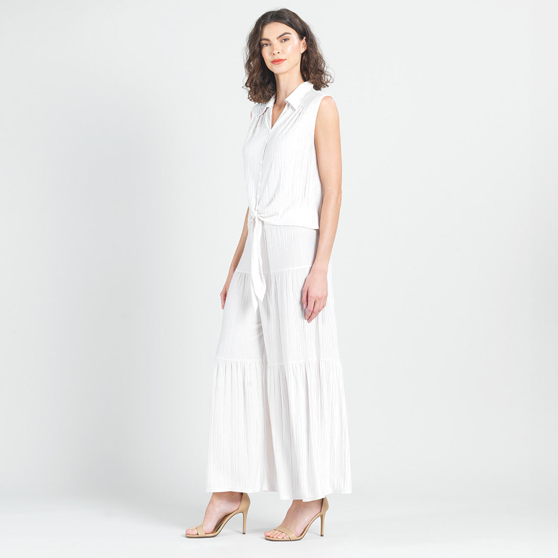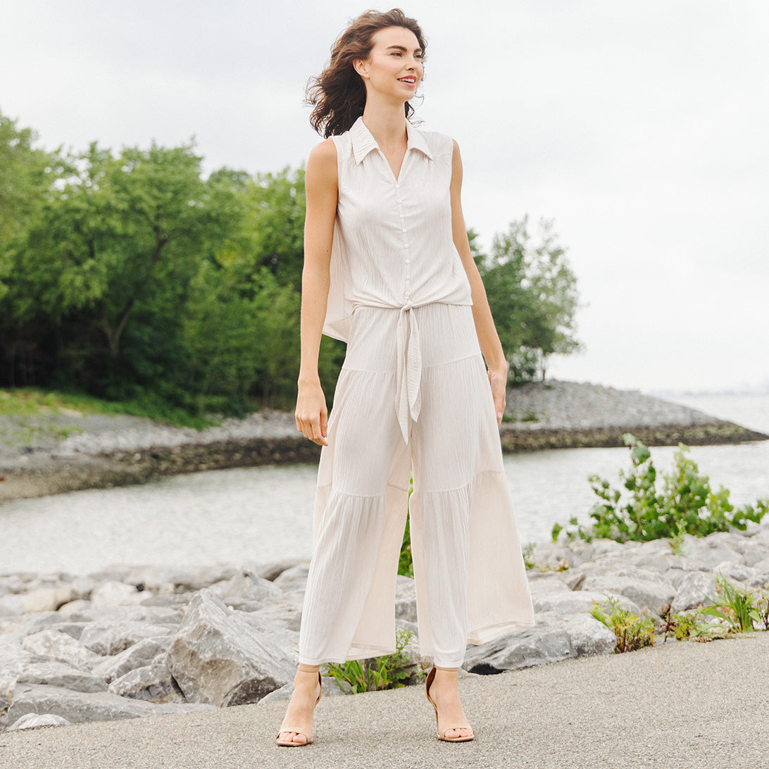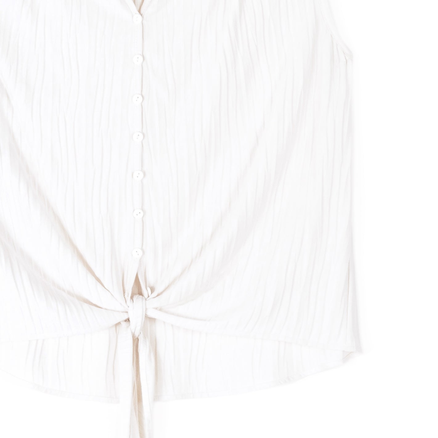 Looking for a style that is as modern as it is elegant? Our Soft Pleat Button Down Tie Hem Top is sure to tie your wardrobe together effortlessly! This sleeveless, bra-friendly top features a collared v-neckline with an 8-button down closure, front and back yoke seams, and an adjustable tie-front hemline for a customizable touch. Our pleated Ivory shade is a true ivory color with a light, creamy-beige undertone, and a radiant-matte finish. A new, luxurious ethereal fabric, inspired by elegant plissé fibers. Designed with a distinct, crinkled-like feel, that is rich in texture while retaining its lightweight shape. It is thin and delicate, allowing it to drape beautifully, and has a radiant-matte finish.Carefree Travel Fabric – Soft Pleated Plissé Knit Our signature rayon-poly blend fabric provides a finish that is rich in texture while being soft, lightweight, and breathable with quick-drying properties. This delicate fabric offers refined durability with crinkled dimension for visual interest. Perfect for warm or transitional weather, you can pack it up and go with ease!Front-Tie Hemline 8 Button-Down Closure Collared Top Wrinkle Free Travel Friendly Ultra Lightweight Soft Pleated Fabric Crinkled Plissé Texture