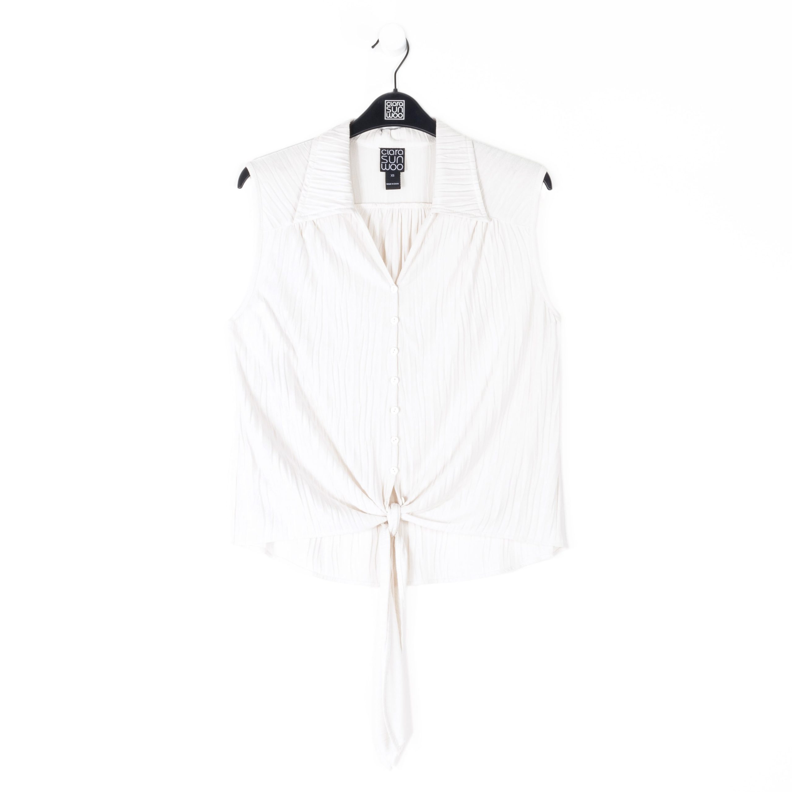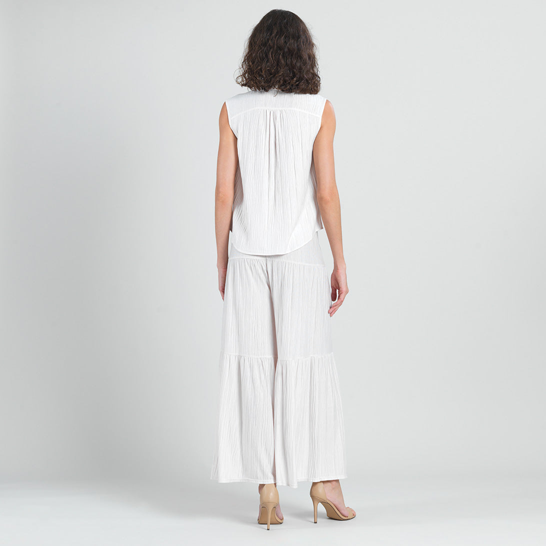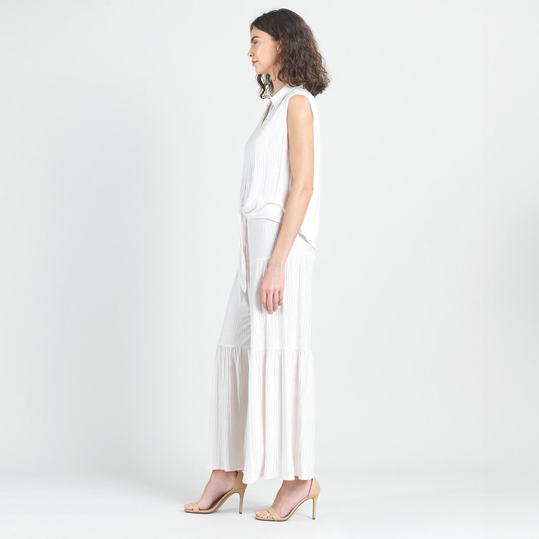 Looking for a style that is as modern as it is elegant? Our Soft Pleat Button Down Tie Hem Top is sure to tie your wardrobe together effortlessly! This sleeveless, bra-friendly top features a collared v-neckline with an 8-button down closure, front and back yoke seams, and an adjustable tie-front hemline for a customizable touch. Our pleated Ivory shade is a true ivory color with a light, creamy-beige undertone, and a radiant-matte finish. A new, luxurious ethereal fabric, inspired by elegant plissé fibers. Designed with a distinct, crinkled-like feel, that is rich in texture while retaining its lightweight shape. It is thin and delicate, allowing it to drape beautifully, and has a radiant-matte finish.Carefree Travel Fabric – Soft Pleated Plissé Knit Our signature rayon-poly blend fabric provides a finish that is rich in texture while being soft, lightweight, and breathable with quick-drying properties. This delicate fabric offers refined durability with crinkled dimension for visual interest. Perfect for warm or transitional weather, you can pack it up and go with ease!Front-Tie Hemline 8 Button-Down Closure Collared Top Wrinkle Free Travel Friendly Ultra Lightweight Soft Pleated Fabric Crinkled Plissé Texture
