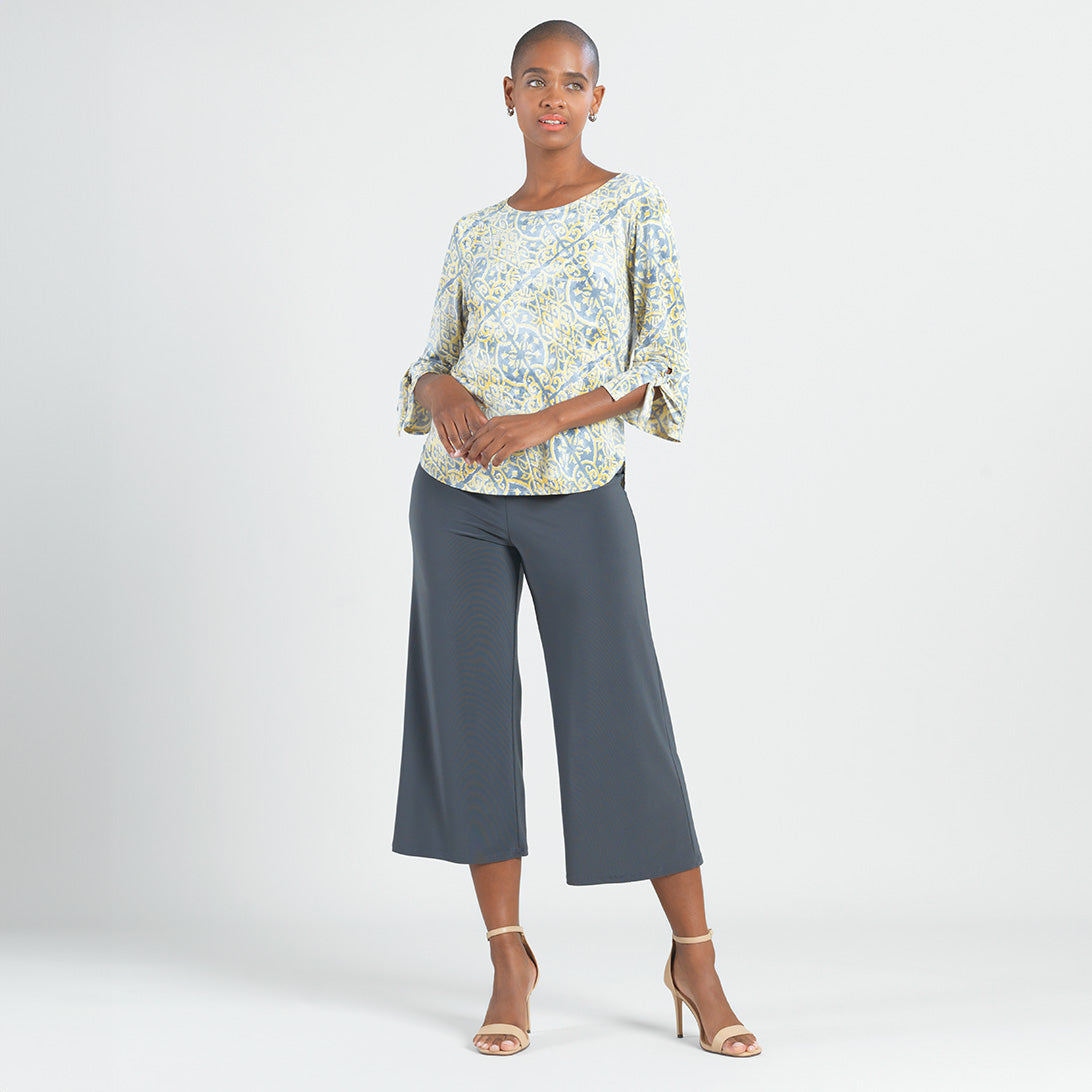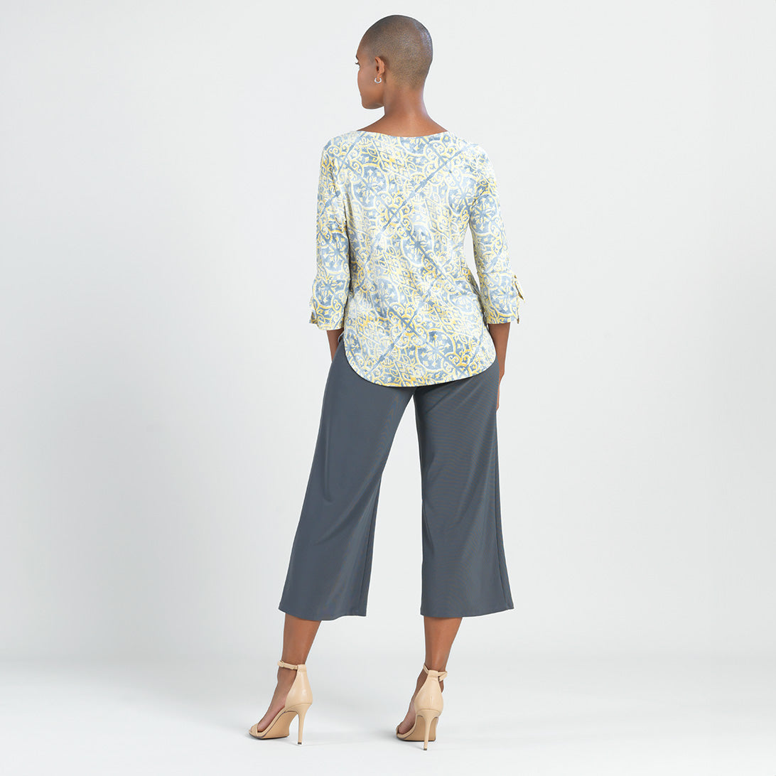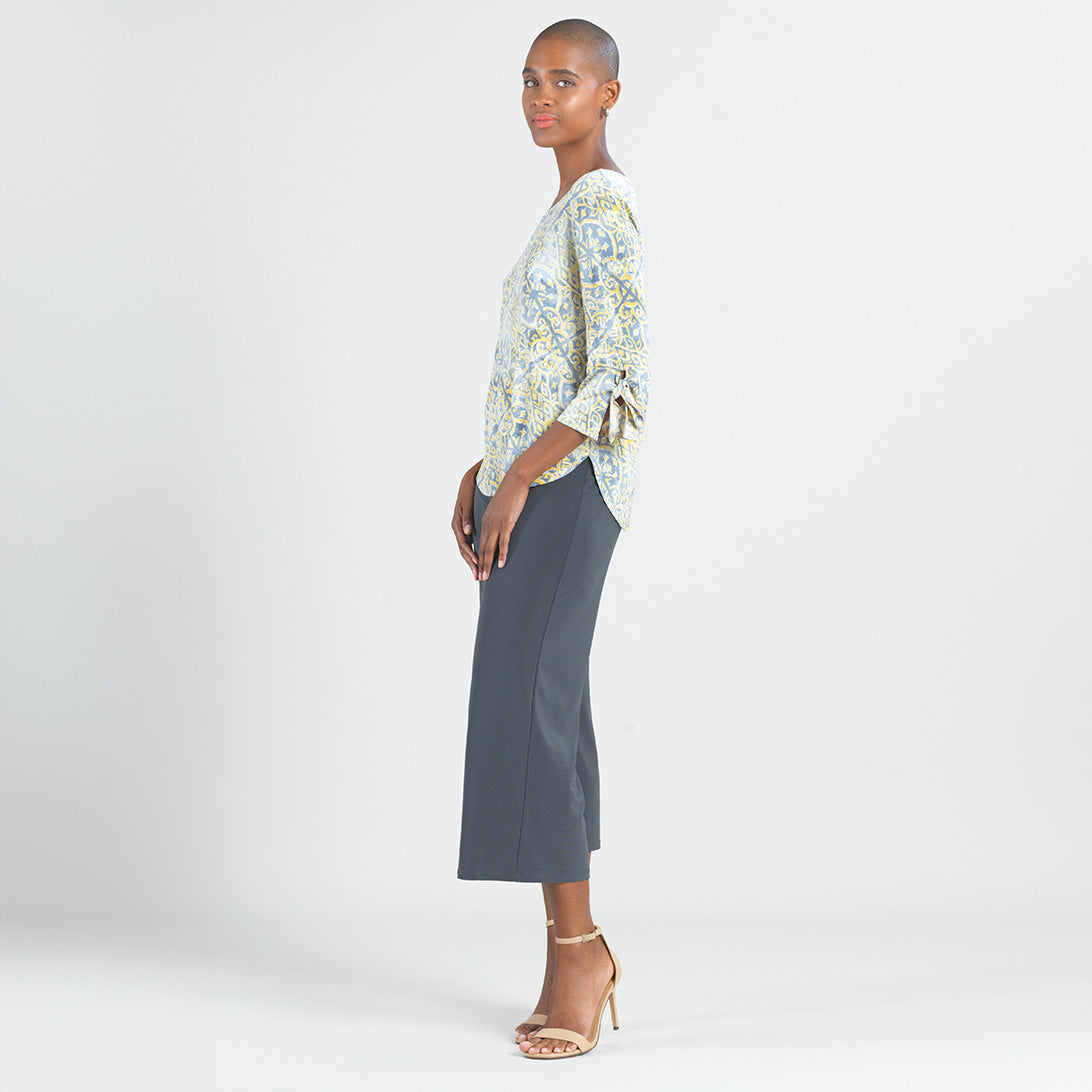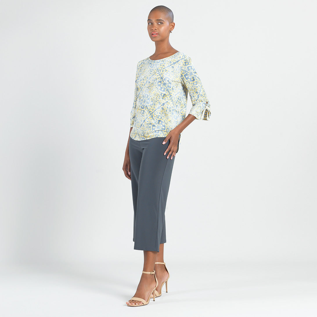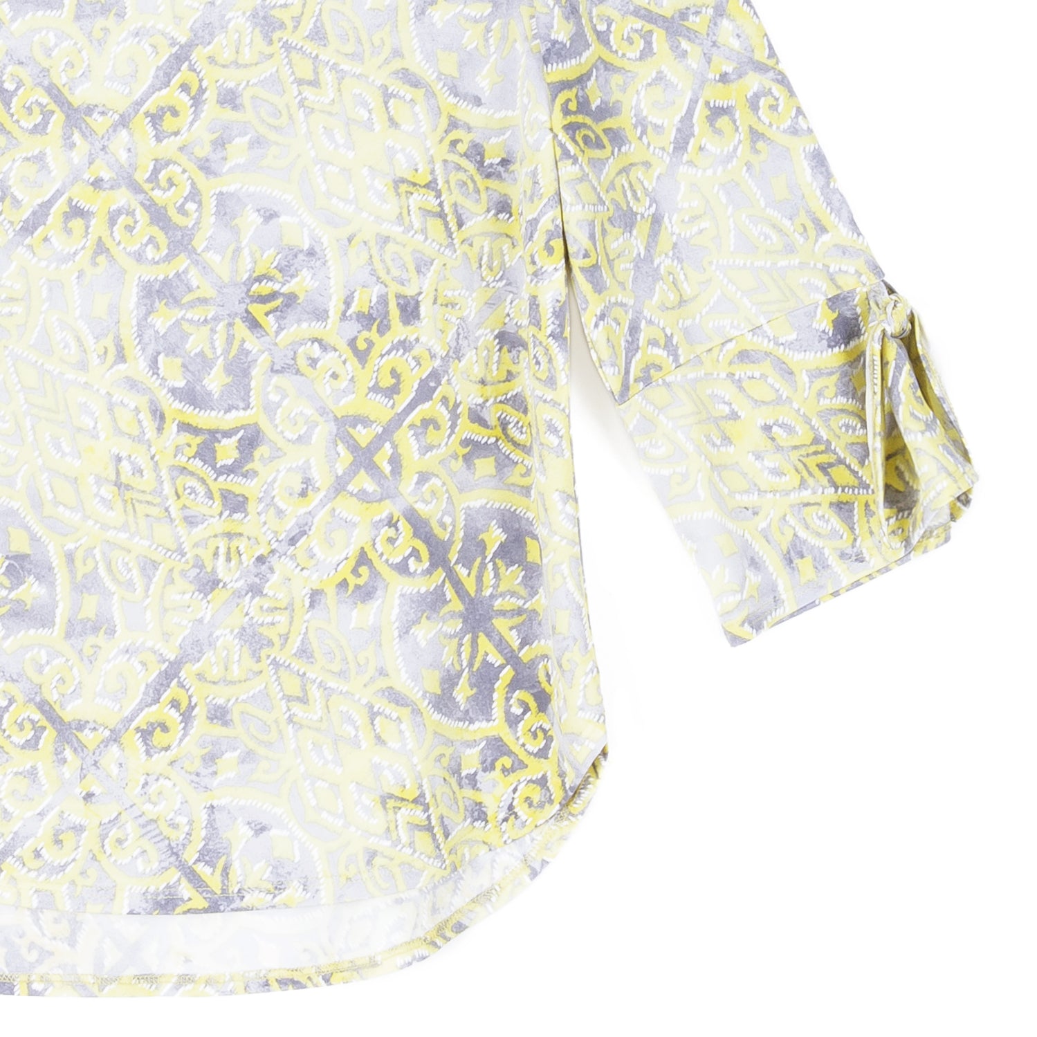 No other style will put your fashion senses at ease, quite like our Mosaic Emblem Textured Tie Cuff Curved Hem Top! This top features a round neckline, elbow-length sleeves with tie-able flared cuff details, and a slight hi-low scalloped hemline. A soothing print, featuring a mosaic arrangement of emblem shapes in shades of soft yellow, light charcoal, and white with an embossed threading texture. ♥ Each piece is a unique, one-of-a-kind print and print placement will vary.Carefree Travel Fabric – Soft Silky Knit with Embossed TextureOur signature poly blend fibers feature an embossed texture print. It’s breathable, quick-drying, and wrinkle-free – making it ideal for travel. Cooler than linen or cotton and easy to care for, it provides an unbeatable combination of style andcomfort.Wrinkle Free Travel Friendly Ultra Lightweight Soft Knit Fabric Breathable Jersey-Like Feel Embossed Threading Detail