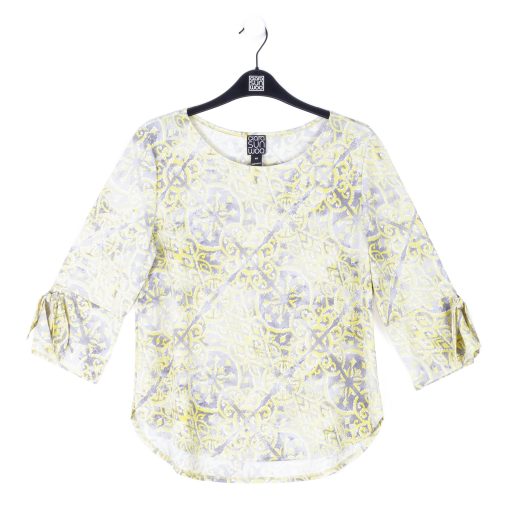 No other style will put your fashion senses at ease, quite like our Mosaic Emblem Textured Tie Cuff Curved Hem Top! This top features a round neckline, elbow-length sleeves with tie-able flared cuff details, and a slight hi-low scalloped hemline. A soothing print, featuring a mosaic arrangement of emblem shapes in shades of soft yellow, light charcoal, and white with an embossed threading texture. ♥ Each piece is a unique, one-of-a-kind print and print placement will vary.Carefree Travel Fabric – Soft Silky Knit with Embossed TextureOur signature poly blend fibers feature an embossed texture print. It’s breathable, quick-drying, and wrinkle-free – making it ideal for travel. Cooler than linen or cotton and easy to care for, it provides an unbeatable combination of style andcomfort.Wrinkle Free Travel Friendly Ultra Lightweight Soft Knit Fabric Breathable Jersey-Like Feel Embossed Threading Detail
