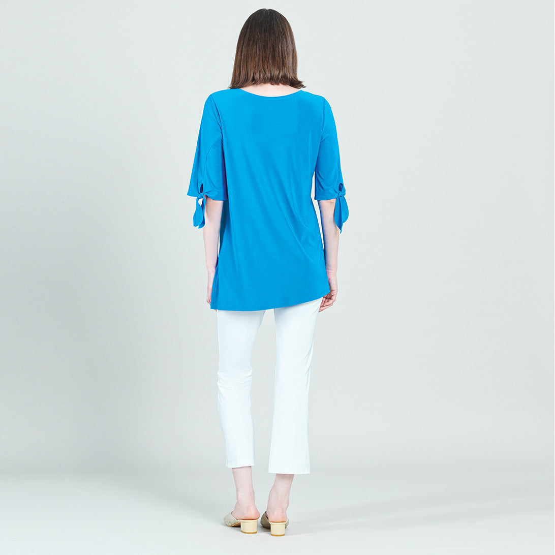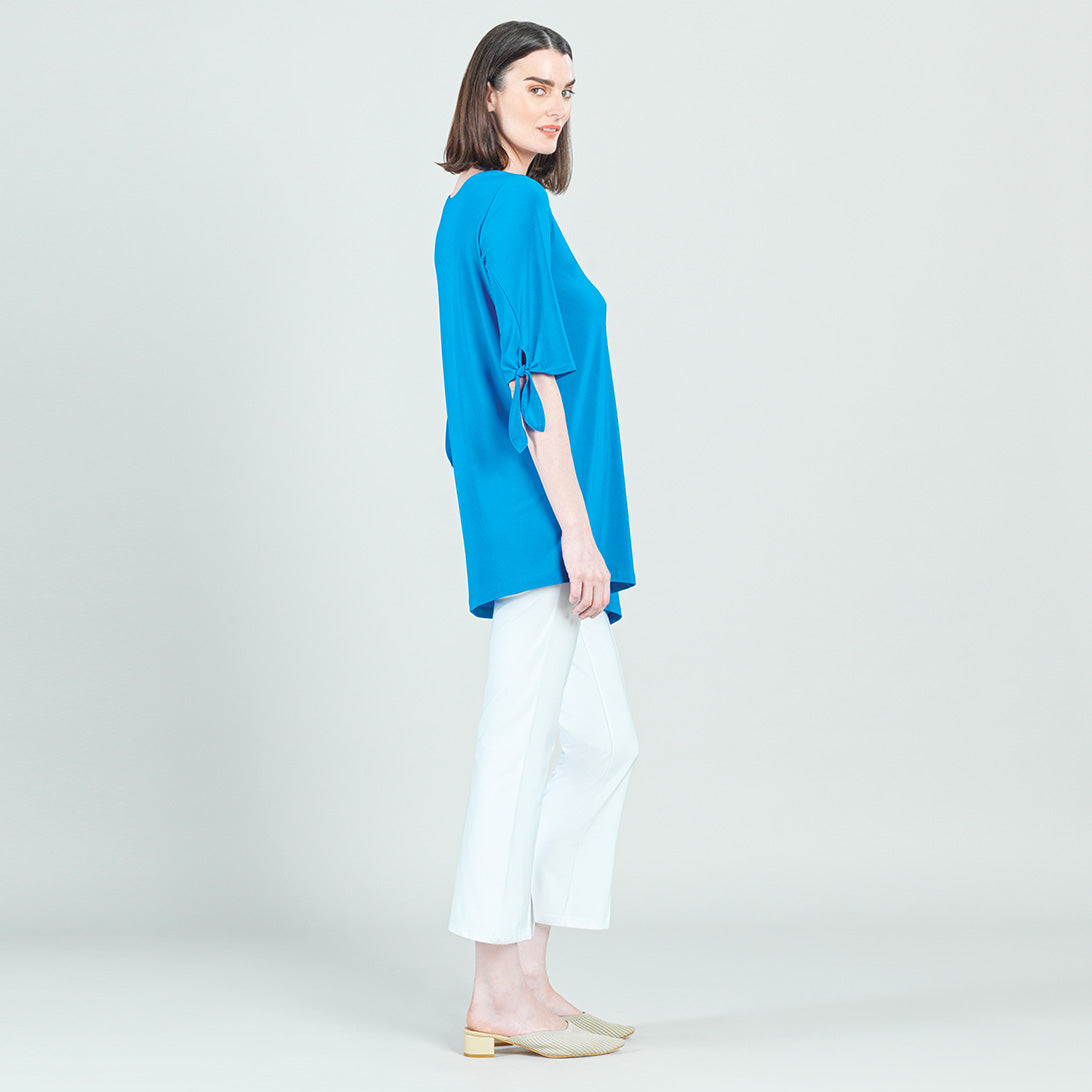 No matter the angle, our Tie Cuff Asymmetrical Vent Tunic is sure to impress! This style features a scoop neckline, elbow-length sleeves with tie-able cuffs, and an asymmetrical hemline with a left-side vent. Our Brilliant Blue shade is a warm, mid-tone color with vibrant, cyan undertones. Carefree Travel Fabric – Soft Silky Knit Our signature poly blend fibers offer luxurious softness with lightweight, wrinkle-free comfort. This easy-care fabric is quick drying and cooler than linen or cotton, making it perfect for on-the-go wear.Wrinkle Free Travel Friendly Ultra Lightweight Soft Knit Fabric Breathable Jersey-Like Feel