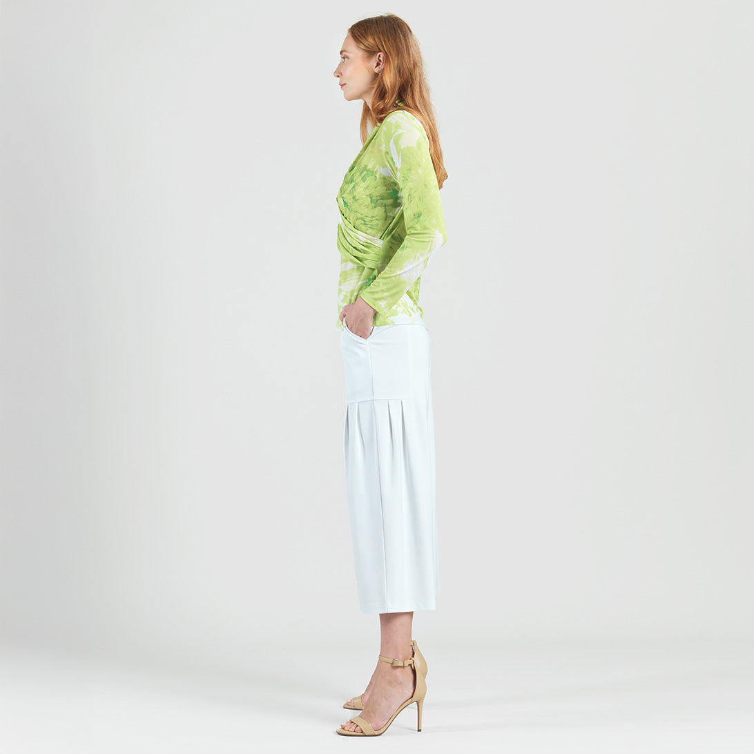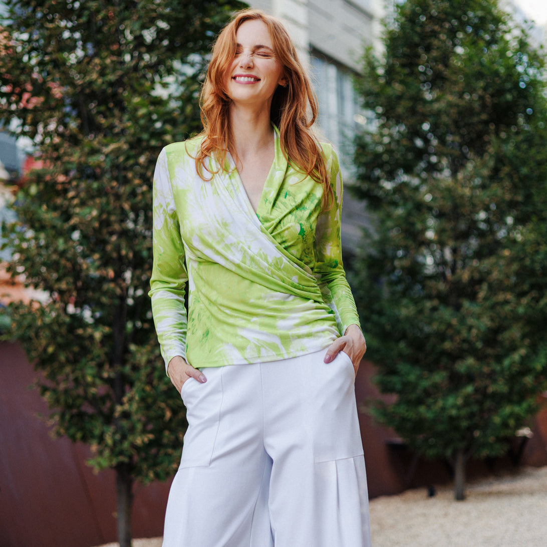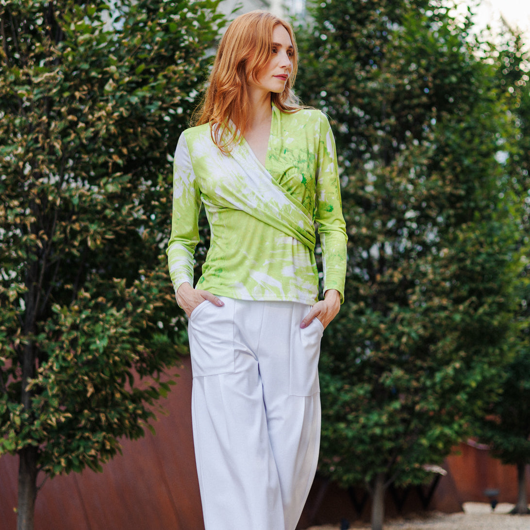 When life gives you lemons or lime… wear our Floral Citrus V-Neck Draped Pleat Top! This flattering top features long sleeves, a v-neckline with a draped pleat detail that creates a faux overlay that accentuates the figure, and a straight hemline. A vibrant, energetic print featuring an artistic blend of sweeping brushstrokes that create an abstract watercolor floral design in shades of lime and true greens, with subtle hints of white and undertones of yellow. ♥ Each piece is a unique, one-of-a-kind print and print placement will vary. Carefree Travel Fabric – Soft Silky Knit Our signature poly blend fibers offer luxurious softness with lightweight, wrinkle-free comfort. This easy-care fabric is quick drying and cooler than linen or cotton, making it perfect for on-the-go wear.Wrinkle Free Travel Friendly Ultra Lightweight Soft Knit Fabric Breathable Jersey-Like Feel