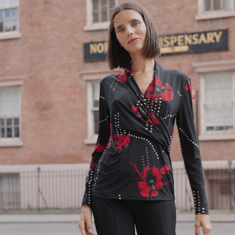 Connect the fashion dots and allow your wardrobe to blossom in our Polka Poppy V-Neck Draped Pleat Top! This flattering top features long sleeves, a v-neckline with a draped pleat detail that creates a faux overlay that accentuates the figure, and a straight hemline. A striking print that displays a motif of poppy blossoms in shades of crimson and ruby red, encompassed by subtle hints of grey, and cascading white and grey polka dots that infuse a playful and modern twist. ♥ Each piece is a unique, one-of-a-kind print and print placement will vary. Carefree Travel Fabric – Soft Silky Knit Our signature poly blend fibers offer luxurious softness with lightweight, wrinkle-free comfort. This easy-care fabric is quick drying and cooler than linen or cotton, making it perfect for on-the-go wear.Wrinkle Free Travel Friendly Ultra Lightweight Soft Knit Fabric Breathable Jersey-Like Feel