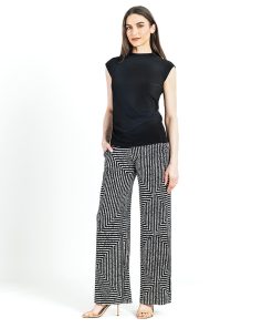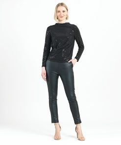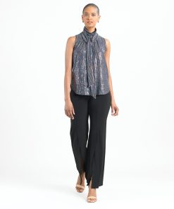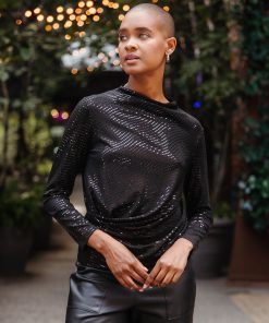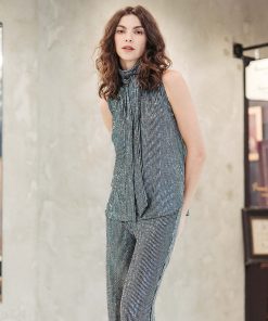 Clara Sunwoo Women’s Shimmer Sequin – Mock Neck-tie Detail Top – Silver Pinstripe | Blacksilver